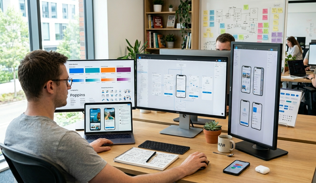 Designers rely on tools like Figma, Adobe XD, and Sketch to create wireframes, prototypes, and final designs. Usability testing helps identify and fix problems before launch.